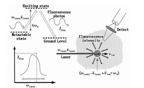 圖1[1]為LIF的基(jī)本原理圖,在一(yī)個三能級(jí)係統中:離子處於亞穩態時,當(dāng)照射激光能(néng)量等於躍遷激發的能(néng)量,離子被泵浦到激發態。由於激發態不穩定,離子又會迅速退激到基態並輻射出熒光。在激發態上停留時間很(hěn)短暫(一般隻有幾納秒寬度)。由於離子不(bú)是靜止的,根據多普勒(lè)效應(yīng)可(kě)知(zhī),在激光傳(chuán)輸方向上存(cún)在一個速度選擇,隻有在激光傳輸方向上滿足一定(dìng)速度的離子才能被特定頻率的(de)激光誘導激發:窄帶激光束(ωlaser,κlaser)入(rù)射(shè),在入射方向上,隻有離子速度(dù)  和激光頻率滿足關係式 時,才能通過相應的激光激發被泵浦到激(jī)發態。對(duì)入射激光頻(pín)率進行掃描變換,測量相應的(de)熒光光強變化,就能得到亞穩態離子速度分布函數在入射激光方向上的投影。如果假(jiǎ)定(dìng)亞穩(wěn)態離子溫度和主體基態離子溫度一致,離子速度分布函數等動力學參數即可獲得(dé)。
