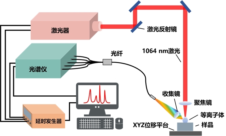激光誘導擊穿光譜實驗是通過超短(duǎn)脈衝激(jī)光聚焦(jiāo)樣品表麵形成(chéng)等離子體,對等離子體發射光譜進行分析來確(què)定樣品的物質成分及含量。超(chāo)短脈衝激光聚焦後能(néng)量密度較高,可以將任何物態(固態、液態、氣(qì)態)的樣品激發形成等離子體,LIBS技術(原則上)可以分析任何物態的樣品,僅受到激光的(de)功率以及探測(cè)光(guāng)譜儀的靈敏度和波長範圍(wéi)的限製。幾乎所有的元素被激發形成等離子體後都會發出特征譜線,因此,LIBS可以分析大多數的元素。基本原理