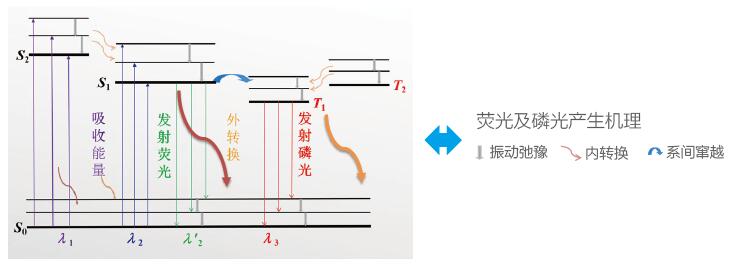 此外(wài),亦會(huì)有電子(zǐ)躍遷至三重態T1 上,再由T1 躍遷至(zhì)基態,我們稱之(zhī)為磷光。