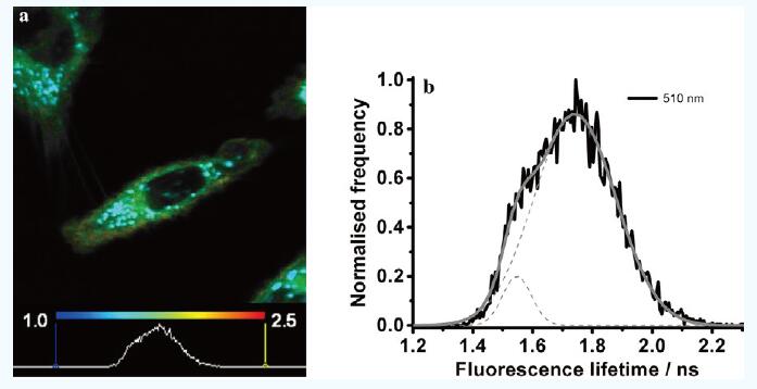 (b) 熒光壽命直方圖,脂肪滴的短壽命約在(zài)1.6ns 附近,細胞中(zhōng)其他位置壽命較長,在1.8ns 附近。