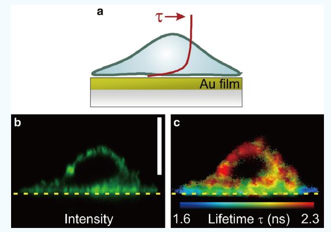 (c) b 圖的FLIM 圖,金表麵附近的(de)GFP 熒光壽命縮短。[2]