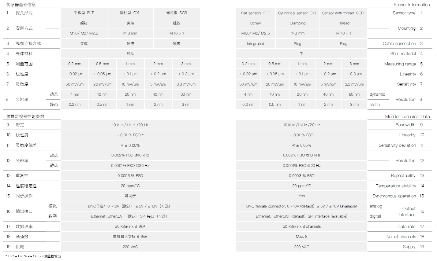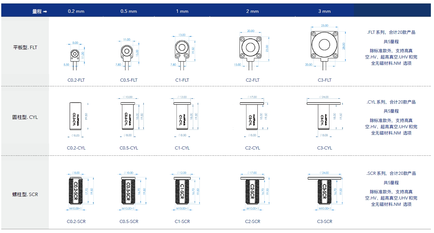 提供平板、圓柱和螺柱(zhù)三種探頭形式,量程覆蓋範(fàn)圍 0.2 mm, 0.5 mm, 1mm, 2mm & 3mm,並提供高真空.HV, 超(chāo)高(gāo)真空.UHV 和完(wán)全無磁材料.NM 的多版本選擇