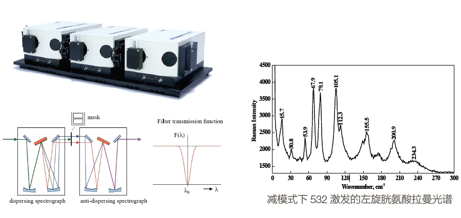 三級聯(lián)譜儀工作在減模式下時,可以獲得超高雜散(sàn)光抑製比,適用於可調(diào)諧激光(guāng)波長的可見或紫外共振拉曼,或者超低波數(shù)拉曼。