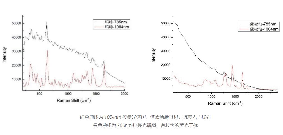 1064nm 手持式拉曼光譜儀可以有效避免熒光幹擾現象,現場直接鑒定大多數高熒光物品,鑒定物品種類更加豐富與準確。
